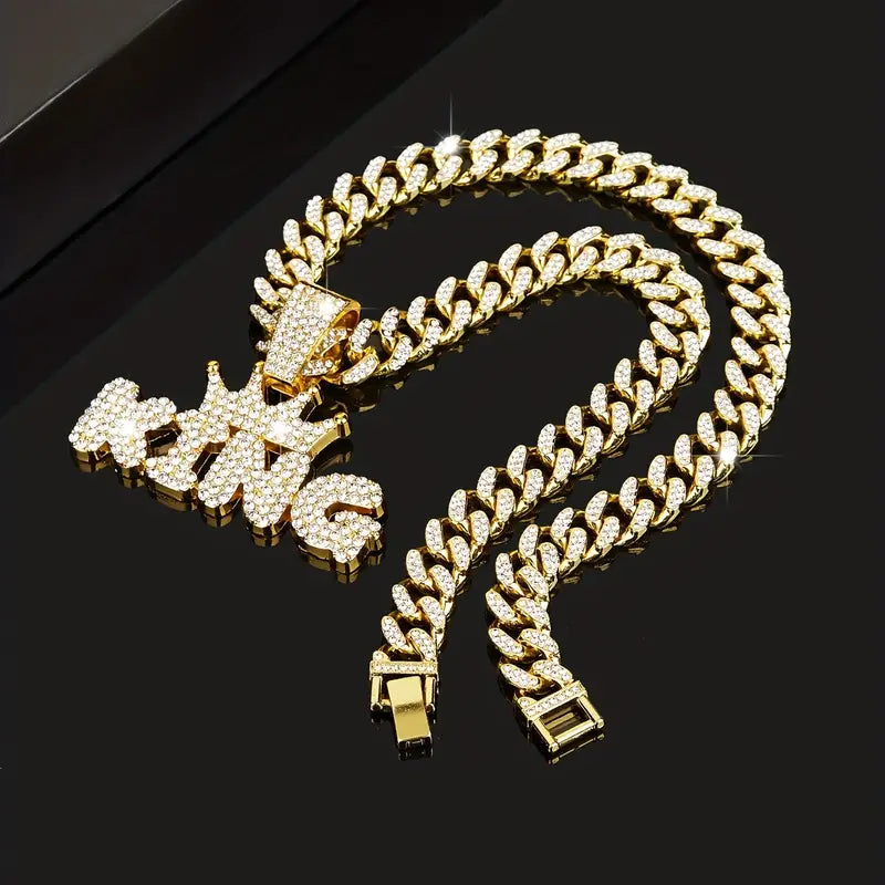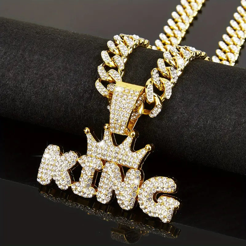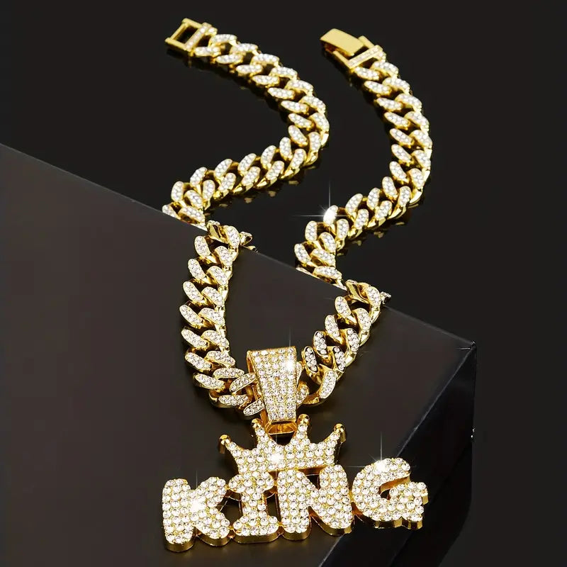 Make a bold statement with this Rhinestone Crown KING Pendant paired with a dazzling Rhinestone Cuban Chain Necklace. Designed to catch every eye, this set combines regal flair with street-smart edge, perfect for those who rule their style kingdom. Shine bright and own your throne wherever you go.