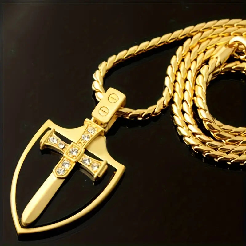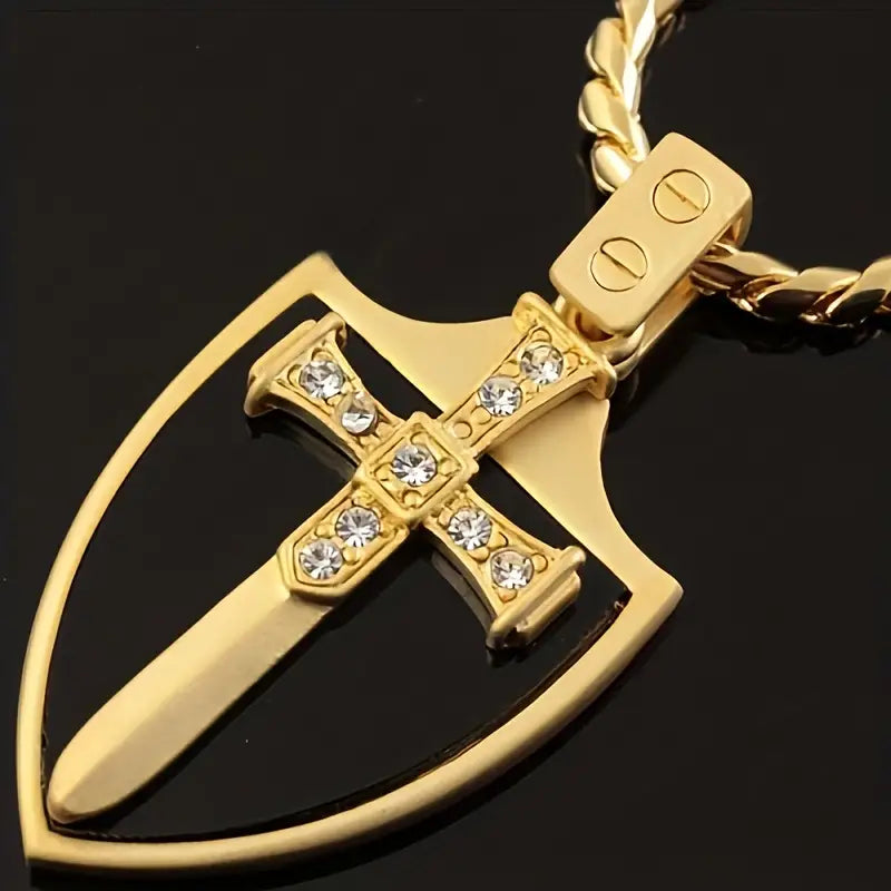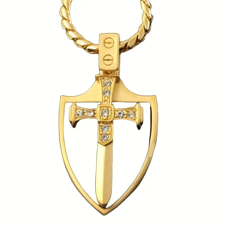 Embrace the spirit of the Knights Templar with this bold Shield Sword Necklace. Crafted to evoke strength and honor, it features a striking shield and sword design that commands attention. Perfect for those who dare to stand out, this necklace symbolizes courage and unwavering resolve. Wear it as a fearless statement of your adventurous spirit.
